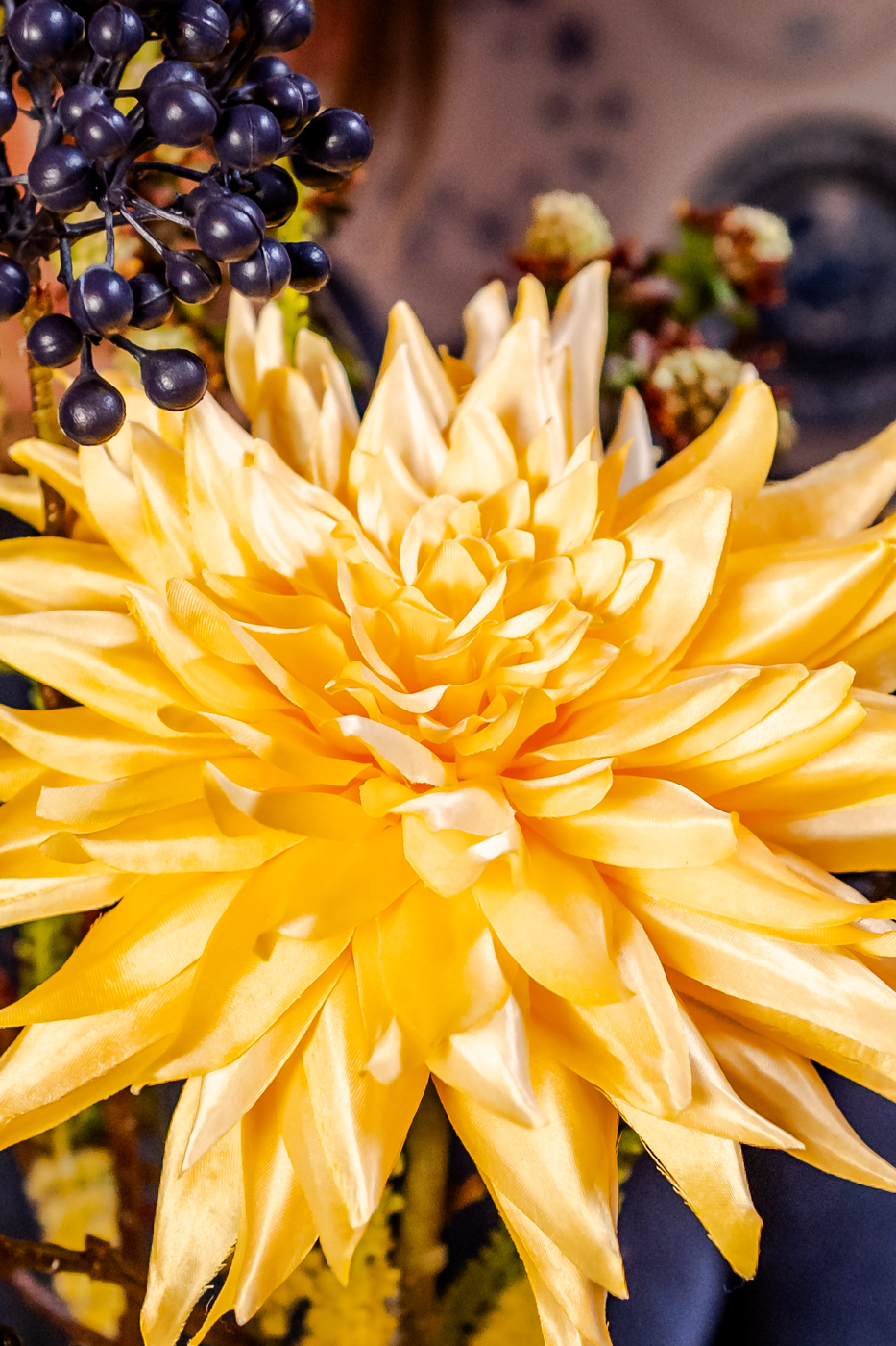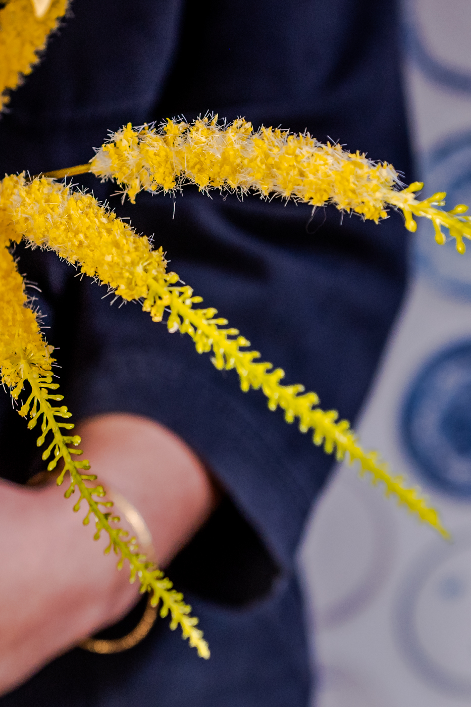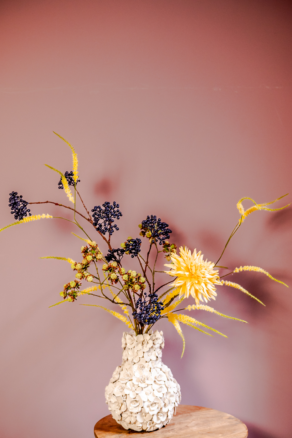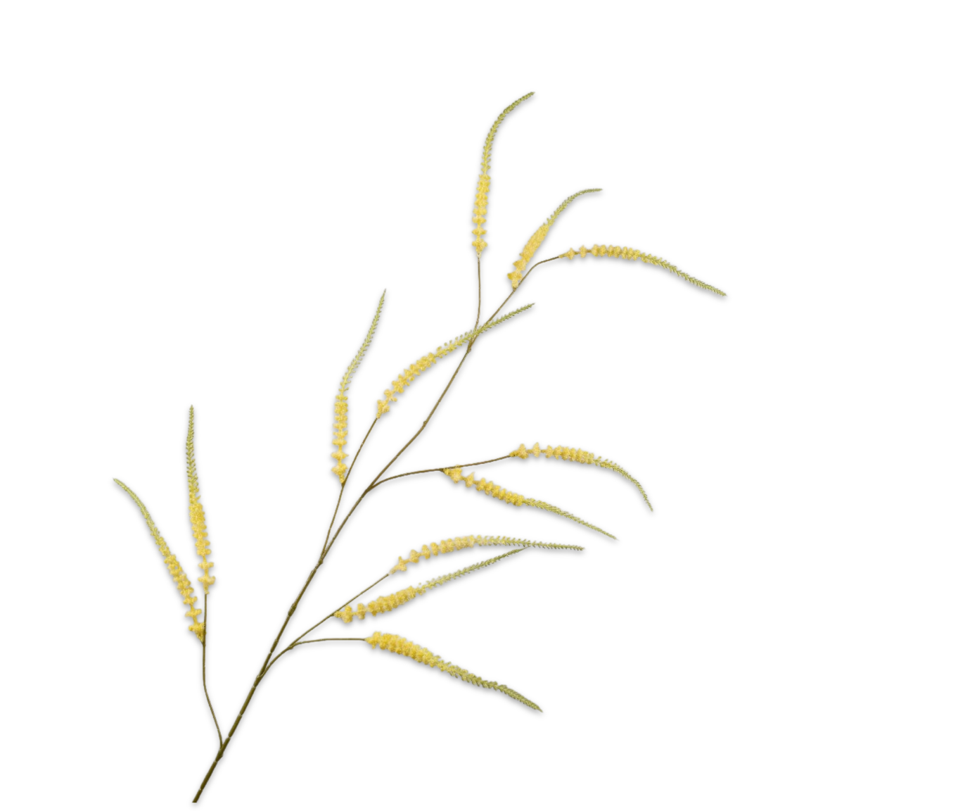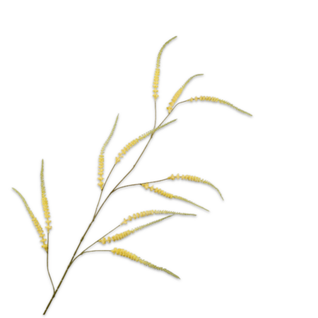 Natuurlijk Fris! Een verrassend fris boeket met verschillende zijden bloemen in de kleuren geel, groen, blauw-zwart. De bloemen zijn niet van echt te onderscheiden. Het boeket, zoals op de afbeelding, bestaat uit 7 takken. De dikte van deze bundeling van stelen kan daardoor nog in een vaas met een smalle hals worden gezet, maar als u het boeket bij elkaar gebonden laat kan het ook in een vaas met een bredere hals.
